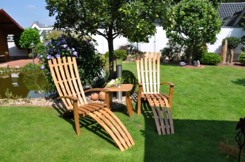 "Arioso" die neue Möbelgruppe bestehend aus zwei Deckchairs und einem kleinen Beistelltisch. Elegante und neue Gruppe die zum Verweilen einlädt. Bequem und vielseitig durch flexible Fußteile die einfach ein- oder ausgeklappt werden können. Material: Hochwertige Gestelle aus Akazien-Hartholz mit Ölfinish behandelt Verschraubungen aus gelb verzinktem Stahl Artikelmaße: Deckchair ausgeklappt: Gesamtlänge: ca. 159 cm Gesamtbreite: ca. 60 cm Gesamthöhe: ca.106 cm Sitzhöhe: ca. 26/35 cm Höhe der Rückenlehne: ca. 92 cm Deckchair eingeklappt: Gesamtlänge: ca. 98 cm Sitzbreite: ca. 40/49 cm Beistelltisch: Gesamtlänge: ca. 50 cm Gesamtbreite: ca.50 cm Gesamthöhe: ca. 50 cm Die Lieferung erfolgt in 3 Packstücken, zerlegt, inkl. Aufbauanleitung