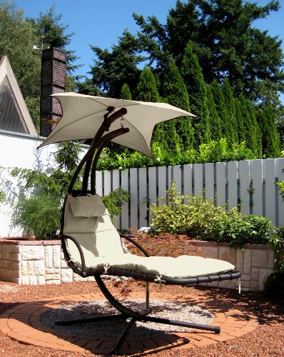 Schwebender Luxus - Schwingliege im modernen Design für Wellness im eigenen Garten. Die an einem Punkt aufgehängte Liege ist in alle Richtungen schwingend. Das verstellbare Sonnensegel bietet Ihnen Schutz vor zu viel Sonne.Das sternenförmige Sonnensegel ist mittels einer Schraube seitlich oder auch in der Höhe am Hauptrohr verstellbar. Die Schwingliege bietet Ihnen viel Bequemlichkeit durch die gepolsterte Auflage und die Armlehnen. Das Stahlrohrgestell ist standsicher. Wenn Sie darauf Platz nehmen, möchten Sie gar nicht mehr aufstehen. So bequem ist diese Liege. Egal ob zum Sonnen oder zum Erholen.