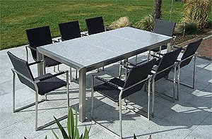 - Sitzgruppe bestehend aus 8 Stühlen und 1 Tisch (205x100cm) aus rostfreiem Edelstahl, gebürstet