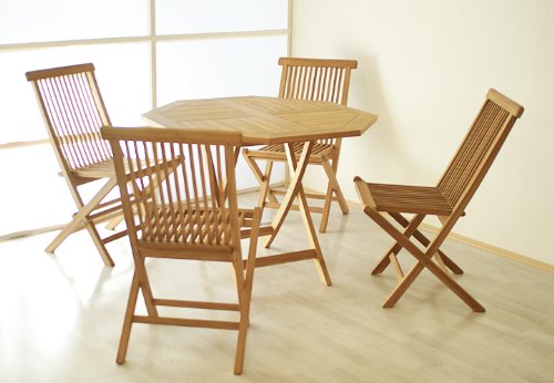 Der Tisch aus exklusivem Teak im modernen Design ist exakt und sauber verarbeitet. Die 4 Klappstühle sind ebenfalls aus erstklassigem massiven Teakholz und sehr bequem.