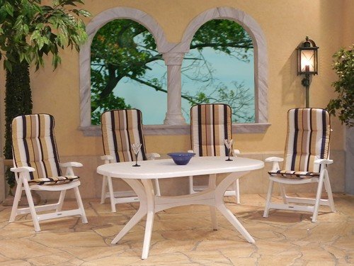Vier Steiner Gartenstühle MARINA + Gartentisch LYON weiß + Sitzauflagen 9623